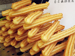 CHURROS,是西班牙语,翻译过来是吉拿的意思,所以被称为吉拿果,另外有的地方也会将其称为吉事果、拉丁果。其外酥里嫩,中间是网格状,色泽金环,冷热皆宜,不油腻,营养丰富。食用时可加上冰淇淋、巧克力汁等丰富的特色辅料,油炸后的香味,冰淇淋的幼滑,再加上巧克力的香浓,味道非常奇妙。