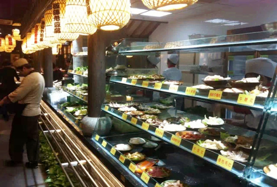 每一种火锅配料,比如金针菇;生菜;海鲜等采用例盘盛装,然后图文并茂,外场服务生见单出品,这样既节约了专门的跑菜人员,也节约了厨房的人力成本。